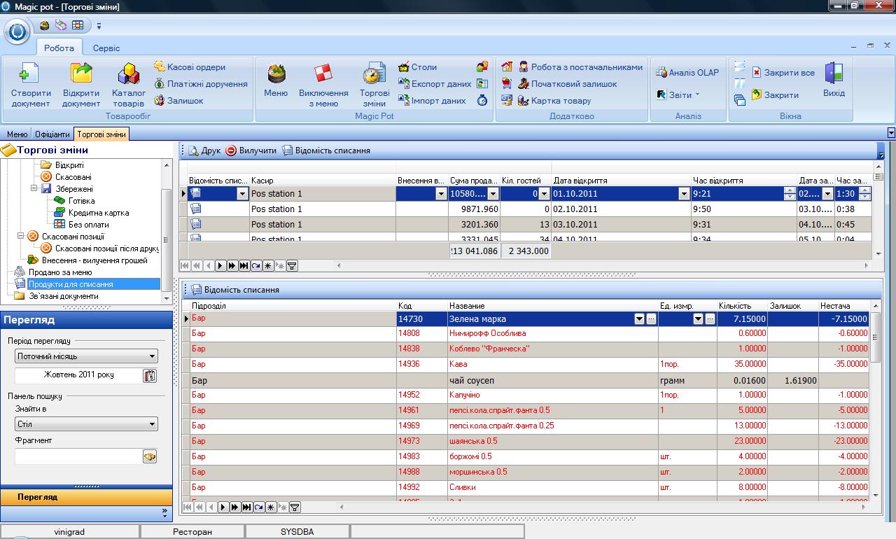 - Списать продукты на основании калькуляций блюд по сменам