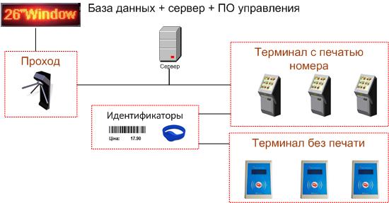 Для "толпы" можно использовать любой идентификатор: входной билет со штрих кодом, карточку с магнитной полосой, RFID браслет и т.д. В качестве контролирующего устройства выступает турникет. Над турникетом размещено световое табло, на котором с определенной периодичностью появляется приглашение для определенного номера очереди.